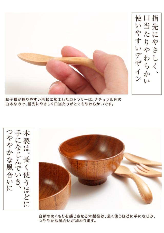 お椀はお子様サイズで安定した作りで、スプーン&フォークはお子様が使いやすいよう、カーブを描いています。