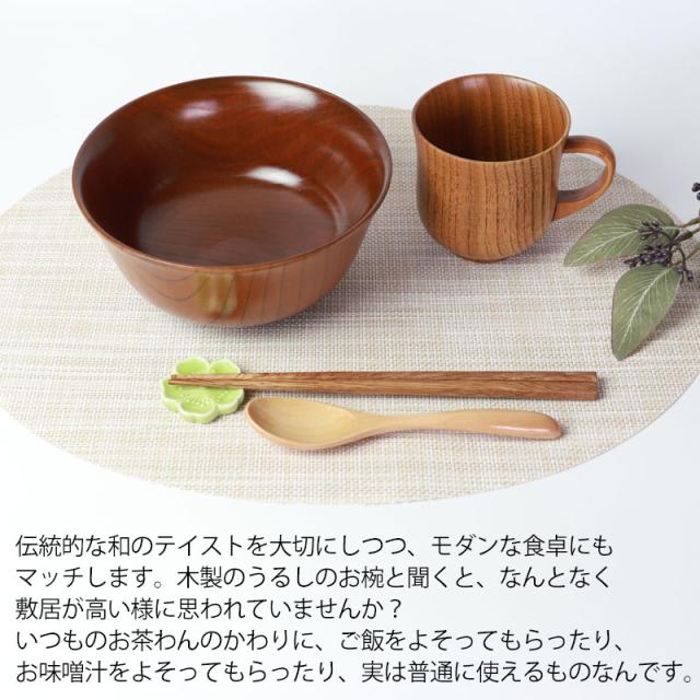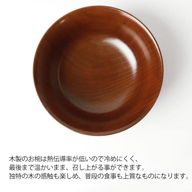 また、木製のお椀は熱伝導率が低いので冷めにくく、最後まで温かいまま、召し上がる事ができます。独特の木の感触も楽しめ、普段の食事も上質なものになります。
