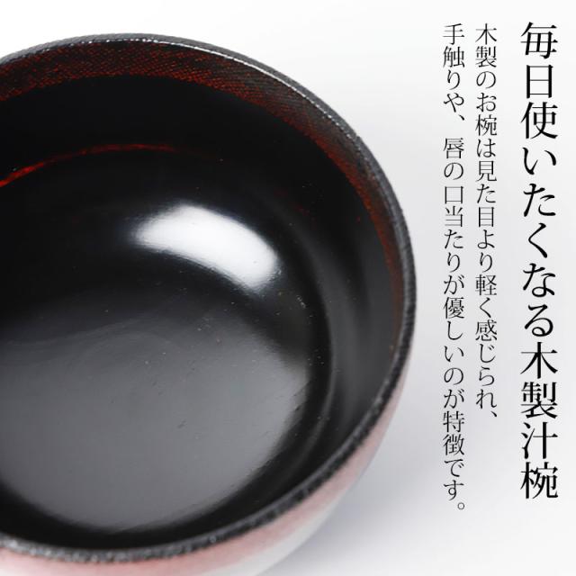 手になじむ天然木の温もり。気品あふれる木製の大汁椀です。 伝統的な和のテイストを大切にしつつ、モダンな食卓にもマッチします。 木製のお椀は見た目より軽く感じられ、唇の口当たりが優しいのが特徴です。 熱伝導率が低いので冷めにくく、最後まで温かいまま、召し上がる事ができます。 気兼ねなく毎日使いたくなる、肌なじみの良い優しい手触り。 独特の木の質感も楽しめ、普段の食事も一層上質なものになります。 曙塗り(あけぼのぬり)とは? 黒地に朱模様を施したものは「曙塗り(あけぼのぬり)」と呼ばれます。 丁寧に下地の色を手作業で研ぎ出しておりますため、出方には個体差があり特徴が異なりますが、手作りならではの漆塗り模様としてお楽しみください。 |
