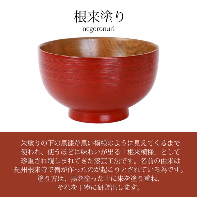 | 商品説明 | 手になじむ天然木の温もり。 気品あふれる木製のお椀です。 気兼ねなく毎日使いたくなる、肌なじみの良い優しい手触りの定番型。 伝統的な和のテイストを大切にしつつ、モダンな食卓にもマッチします。 「食器を手に取る」は日本の食生活ならではのポイントで、軽い木製は疲れにくいので、ストレスなく食事を楽しむことが出来ます。 木製食器は熱伝導率が低いので冷めにくく、最後まで温かいまま、召し上がる事ができます。 独特の木の感触も楽しめ、普段の食事も上質なものに。 用途を選ばないのでスープ、お味噌汁、サラダと幅広くお使いいただけます。 また割れにくく軽いので、お子様のおやつの際にスナック入れとしても活躍してくれそうですね。 刷毛目(はけめ)とは? 漆を塗る刷毛の跡をならさずに、あえてそのまま残す伝統的な塗り方です。 職人が手塗りで仕上げているため刷毛の跡はひとつひとつ微妙に違った見え方となります。 根来塗り(ねごろぬり)、曙塗り(あけぼのぬり)とは? 朱塗りの下の黒漆が黒い模様のように見えてくるまで使われ、使うほどに味わいが出る、「根来模様」として珍重され親しまれてきた漆芸工法です。 名前の由来は紀州根来寺で僧が作ったのが起こりとされている為です。 塗り方は、黒を塗った上に朱を塗り重ね、それを丁寧に研ぎ出します。 根来塗りの反対色の黒地に朱模様にしたものは「曙塗り(あけぼのぬり)」と呼ばれます。 丁寧に下地の色を手作業で研ぎ出しております。 出方には個体差があり特徴が異なりますが、手作りならではの漆塗り模様としてお楽しみください。 |