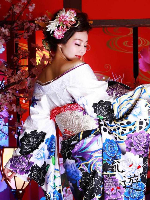 ☆迫力のある大輪の薔薇のふりそでに乱れ菊が施された帯が個性を放つ花魁着物は一着で目立つ豪華なおしたて振袖。