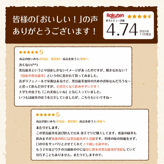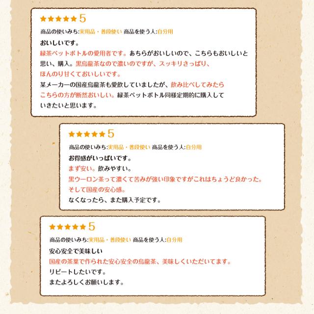 - とても手軽に飲めて美味しく他の黒烏龍茶とは味がしっかりして美味しく脂っこい食後は特に飲んでますお出かけは必ず持っていきます。
