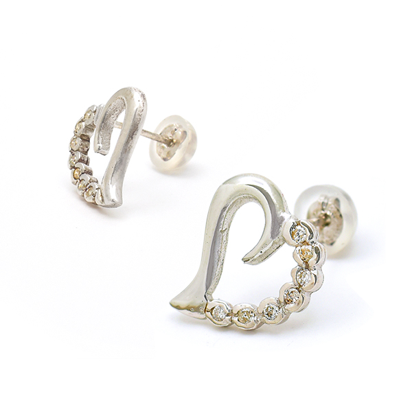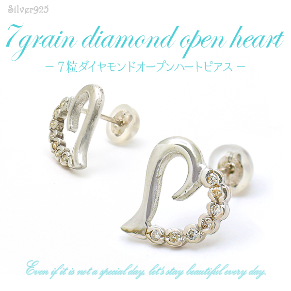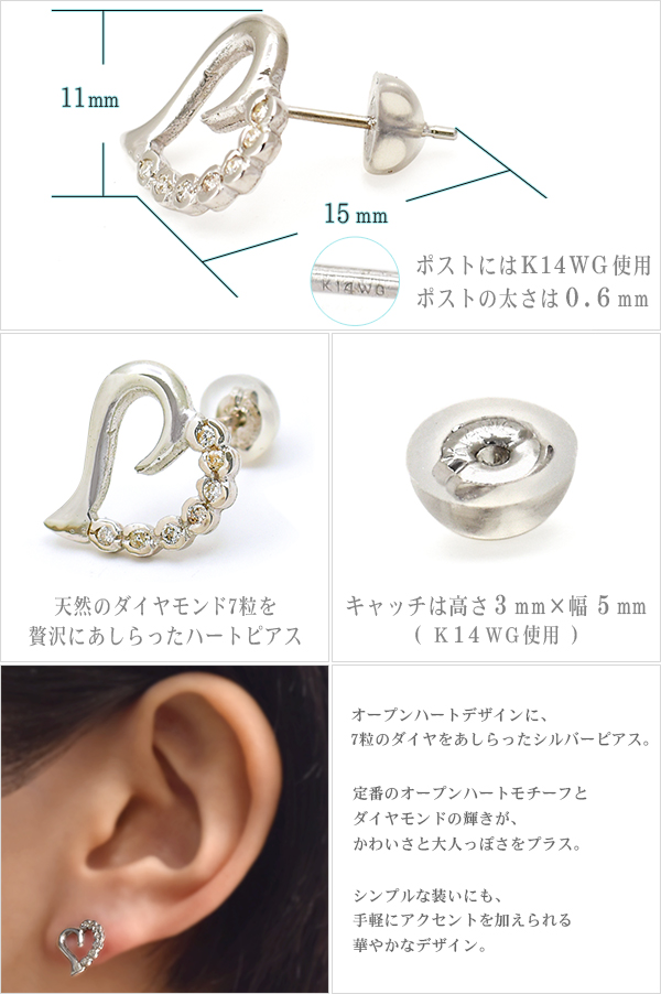 7粒 天然ダイヤモンド オープンハートピアス シルバー925 + K14ホワイトゴールド レディース 可愛い アレルギーフリー プチピアス