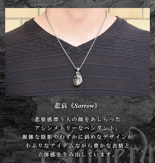 悲愴感漂う人の顔をあしらったアシンメトリーなペンダント。