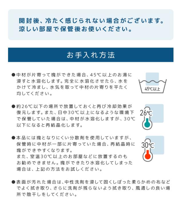 | 注意事項 | ・表面が汚れた場合には、中性洗剤を浸して固く絞ったやわらかめの布などでよく拭き取り、さらに洗剤が残らないよう拭き取り、風通しの良い場所で陰干しをしてください。 ・環境により中材が一部固まった場合は、45℃以上のお湯に浸すと水溶化します。塊がどうしても気になるという場合には、中材を水溶化させたあと、26℃以下の場所で中材が偏らないように平らな状態で放置し、再結晶化させてください。 ・商品は、モニターによって色合いが異なって見える場合があります。 ・仕様・デザインは改良のため予告なく変更することがあります。 |