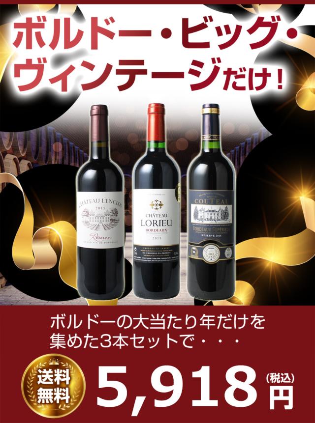 【送料無料】ワインセット 第99弾 2015年 ボルドー 当り年 3本セット ギフト プレゼント 赤ワイン ビッグ・ヴィンテージ ソムリエ厳選 御祝 誕生日 送別 記念品