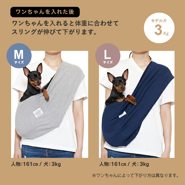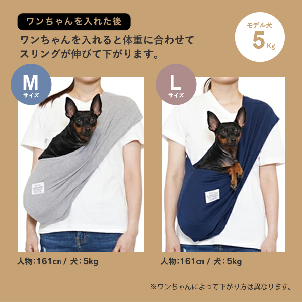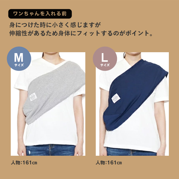 身につけたとき小さく感じますが、伸縮性がかなりあるため、ワンちゃんを入れるとぴったりフィットしてまるで人間の赤ちゃんを抱っこするようにちょうどいいです。