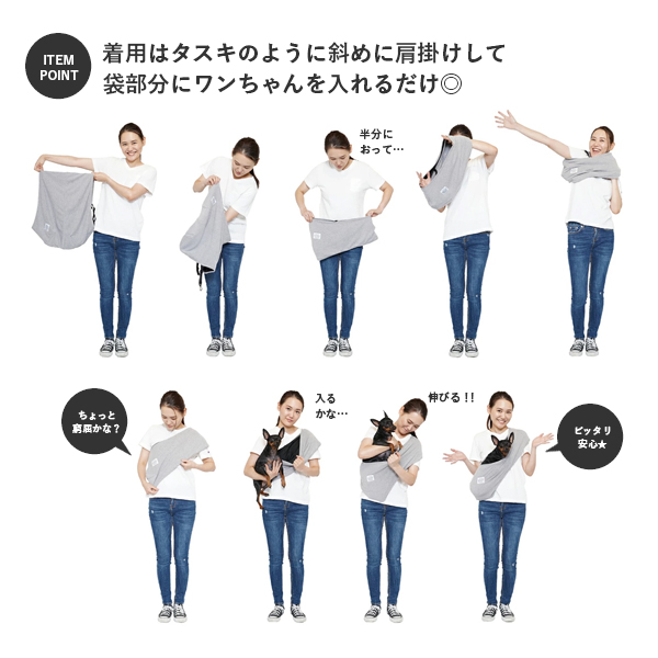- とてもフィット感。4.2キロあるうちのワンコをかばんで肩掛けにすると肩にかなりの重みが……このスリングなら、思ってた通り気になりませんでした。 思い切って買ってよかったです