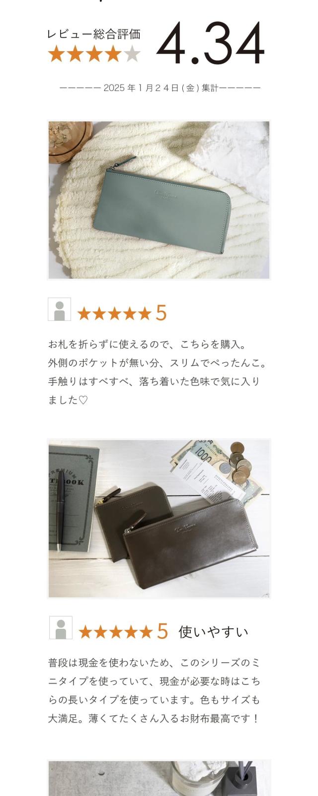 - 今迄使っていたキタムラの財布が20年経ち流石に縫い目が痛んできた為買い替えました。同じ物を買いに行こうとしましたが御社の財布が気になり購入させていただきました。使い勝手も良く、皮も柔らかく大変良いです...
