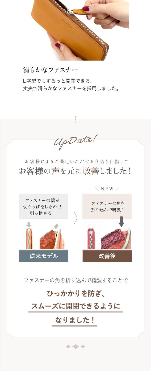 人気のL字ファスナーで薄型、さらに大容量。 内部の小銭入れスペースにはファスナーを使わずともコインが散らばることのない構造を採用。