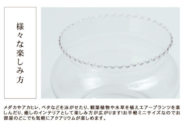 メダカやアカヒレ、ベタなどを泳がせたり、観葉植物や水草を植えエアープランツを楽しんだり、