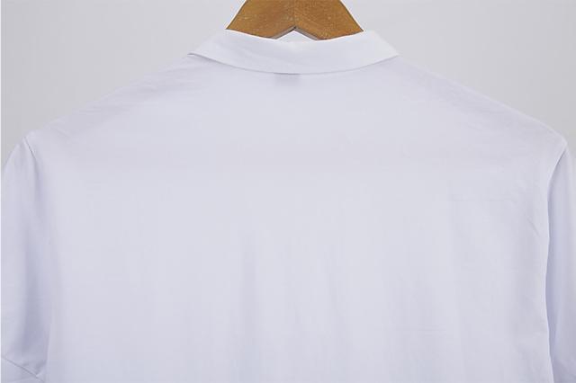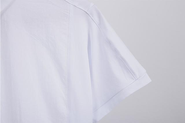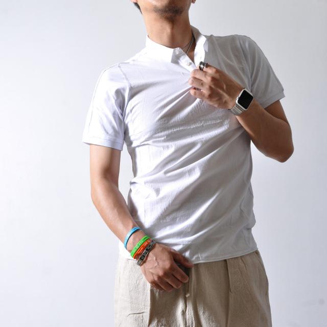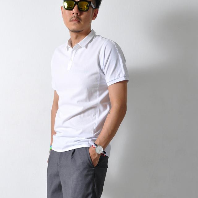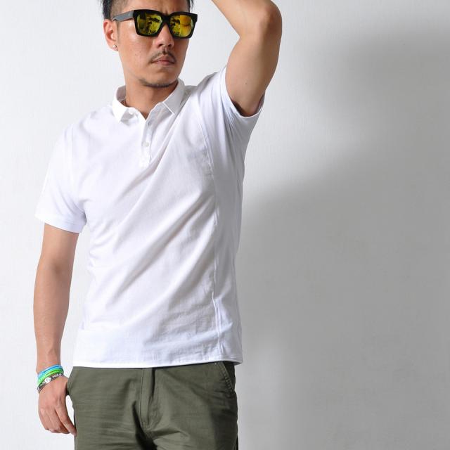 フロントとバックで大胆に生地切り替えがある、半袖ポロシャツです。薄手の生地でこれからの季節を涼しく過ごすのに