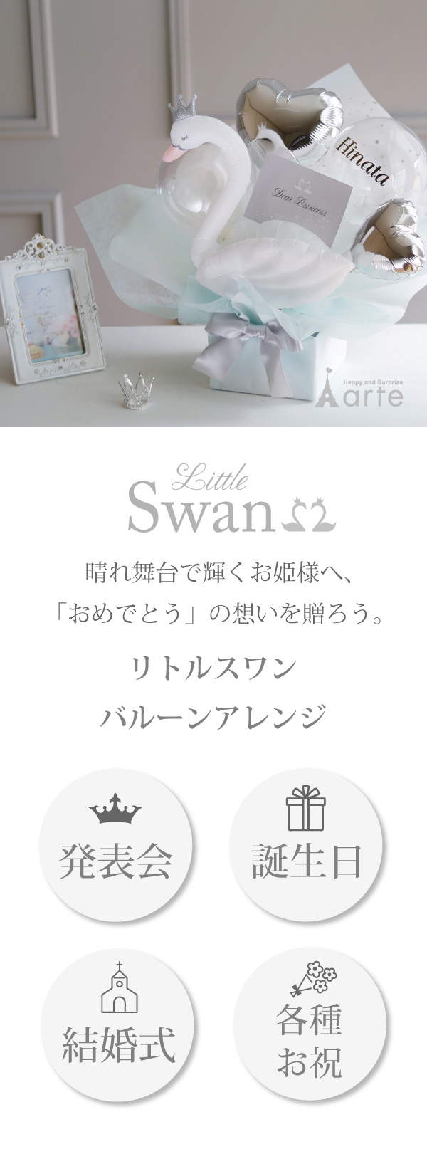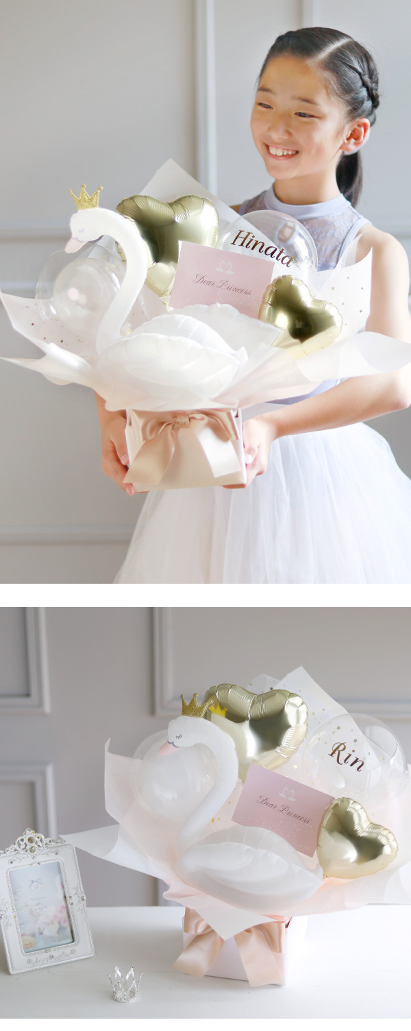 晴れ舞台で輝く素敵なあの子へバルーンアレンジを贈ろう!可愛い白鳥をメインに上品な輝きと透明感が織りなす華やかバルーンアレンジ。子供から大人まで喜んでもらえ、お部屋のインテリアにもなるデザインにこだわりました。発表会はもちろん、お誕生日、結婚式、各種様々なお祝いにおすすめです。