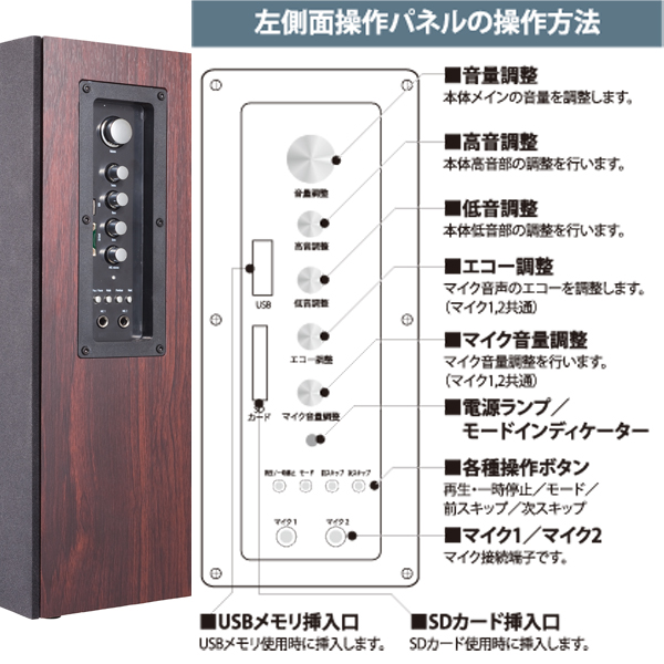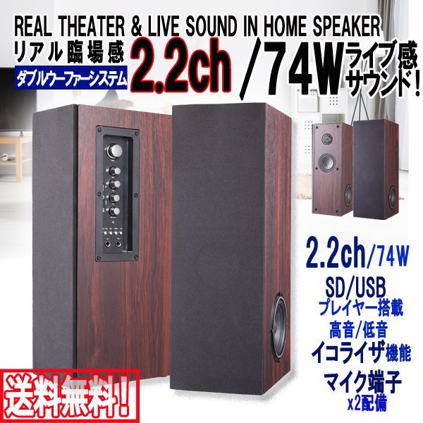 2.2chパワーサウンド重低音マルチスピーカーシステム74W(ウーファー USB SDカード マイク端子 MP3 ライブ 高音)