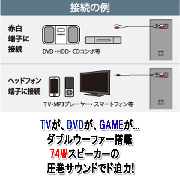 TVが、DVDが、GAMEが... ダブルウーファー搭載74Wスピーカーの圧巻サウンドでド迫力!