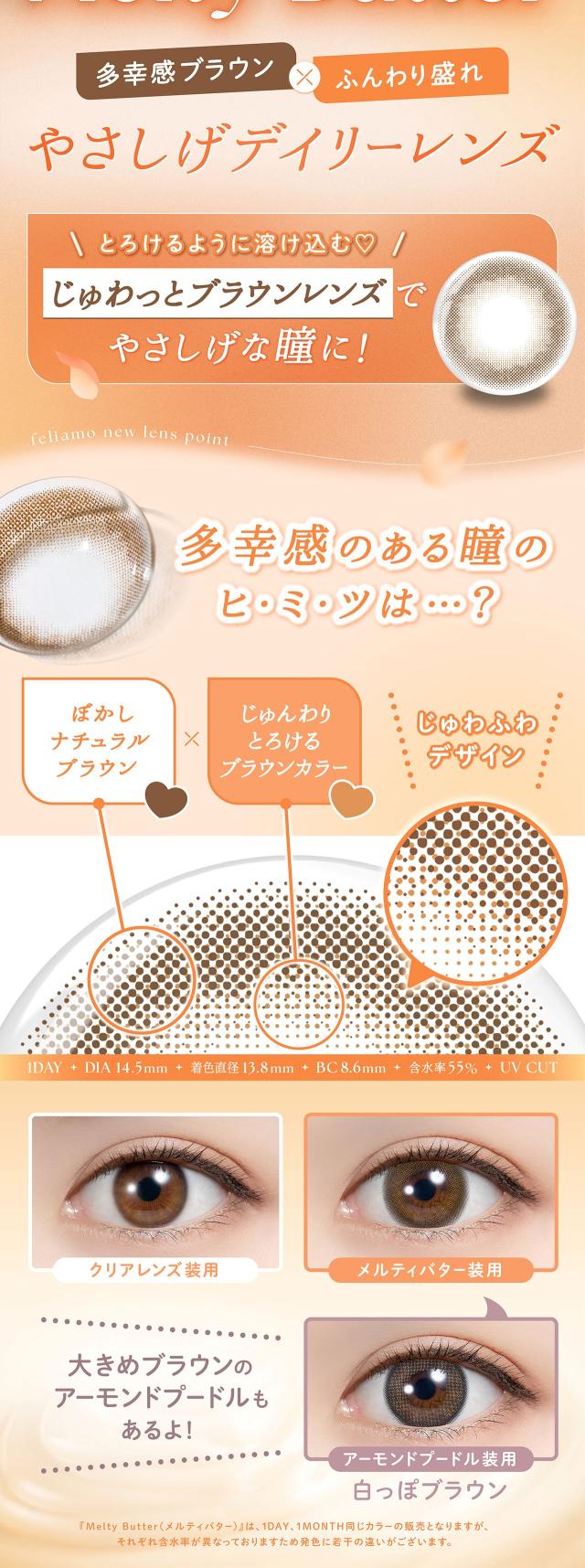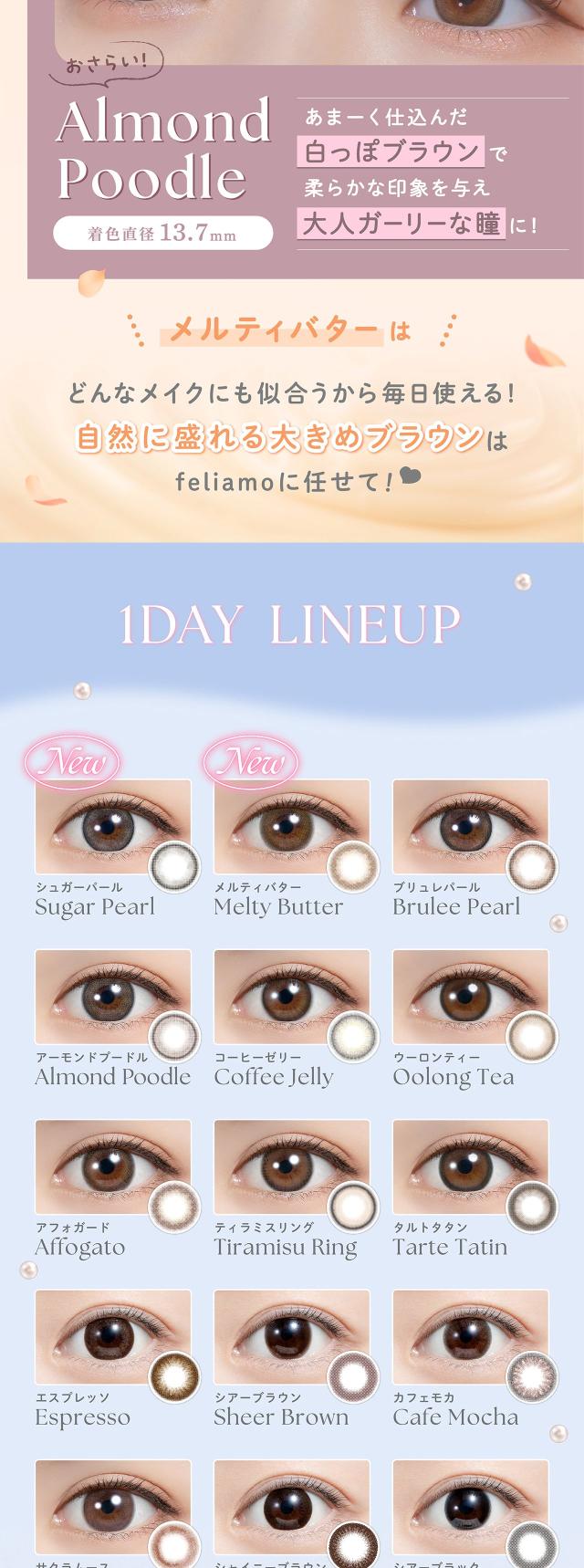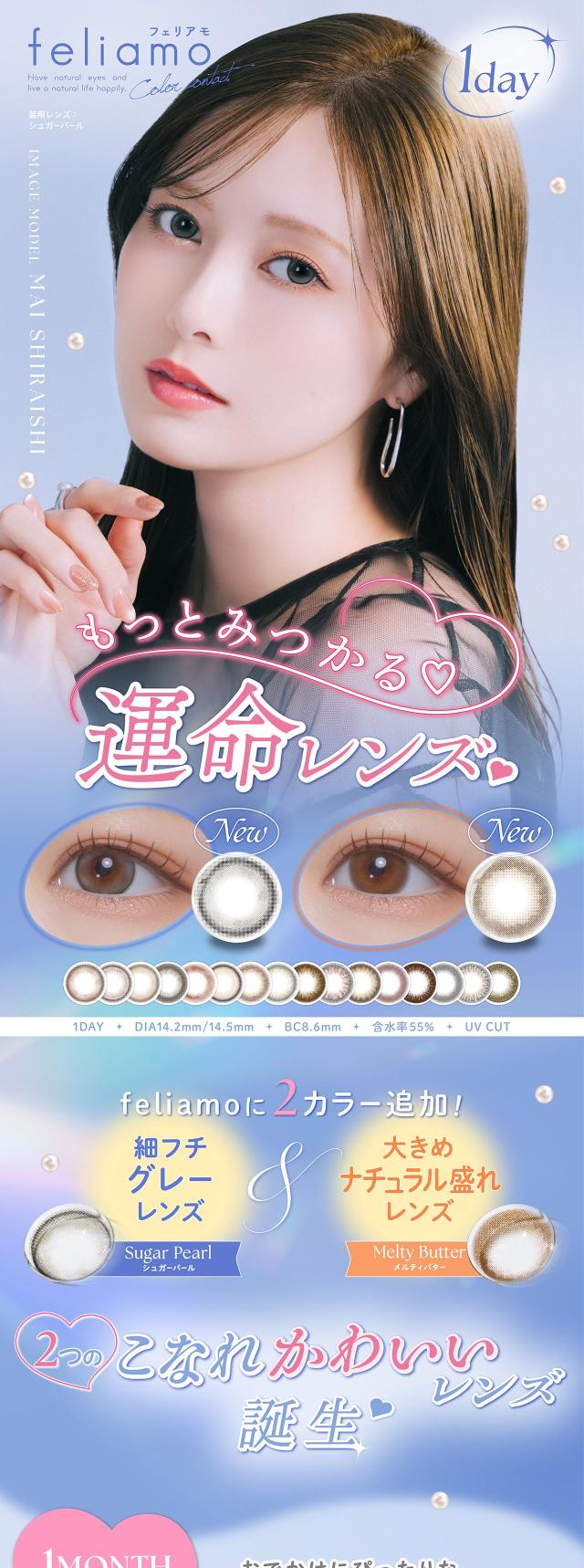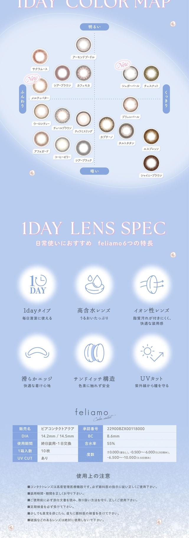 ■商品名: feliamo 1day■枚 数: 1箱 / 10枚入■使用期限: 1日使い捨て■度数(POWER): 度なし(±0.00) -0.50〜-6.00(-0.25ステップ) -6.50〜-10.00(-0.50ステップ)■直径(DIA): 14.2mm/14.5mm■ベースカーブ(BC): 8.6mm■含水率: 55%■種 別: カラコン,カラーコンタクト,カラーコンタクトレンズ コンタクトレンズ,コンタクト■区 分: 高度管理医療機器■医療機器承認番号: 22900BZX00118000■製造販売元: PIA株式会社■販売元: PIA株式会社