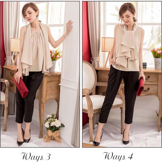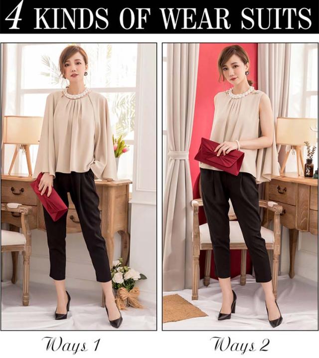 4通りの着こなしが楽しめるケープ付パンツドレス。