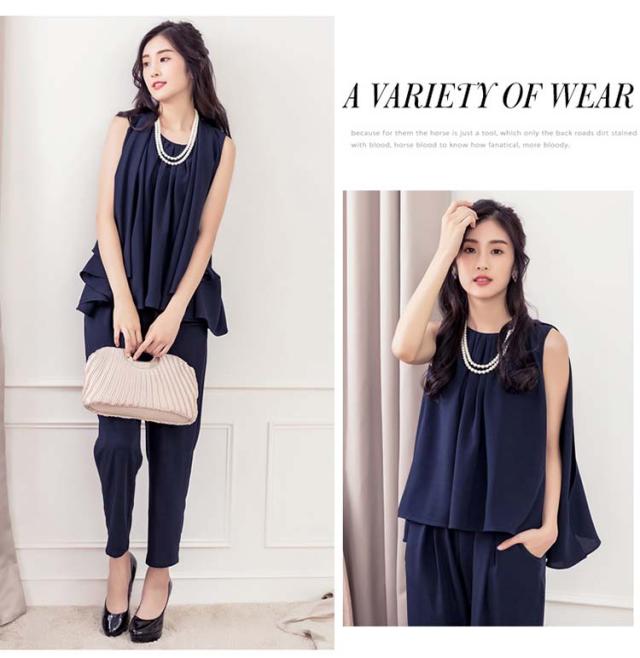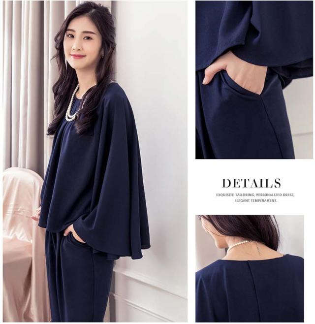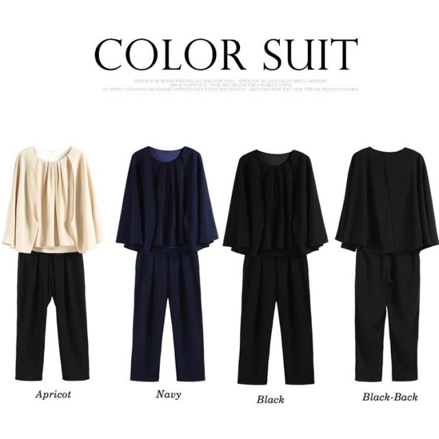 ケープ付きで揺れ感のあるオーバーブラウスと上品なクロップドパンツが女性を輝かせます。