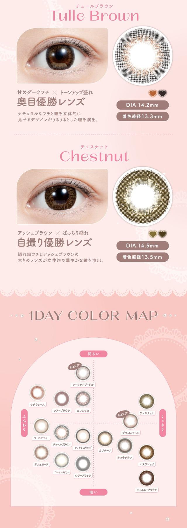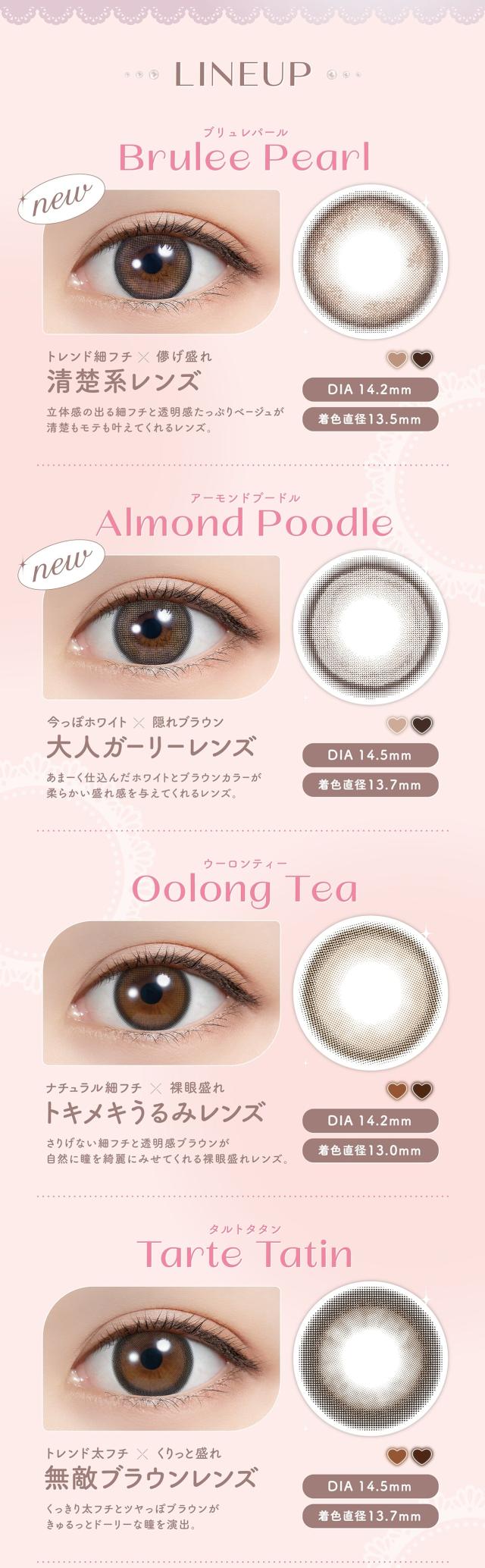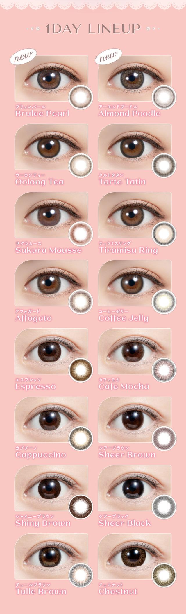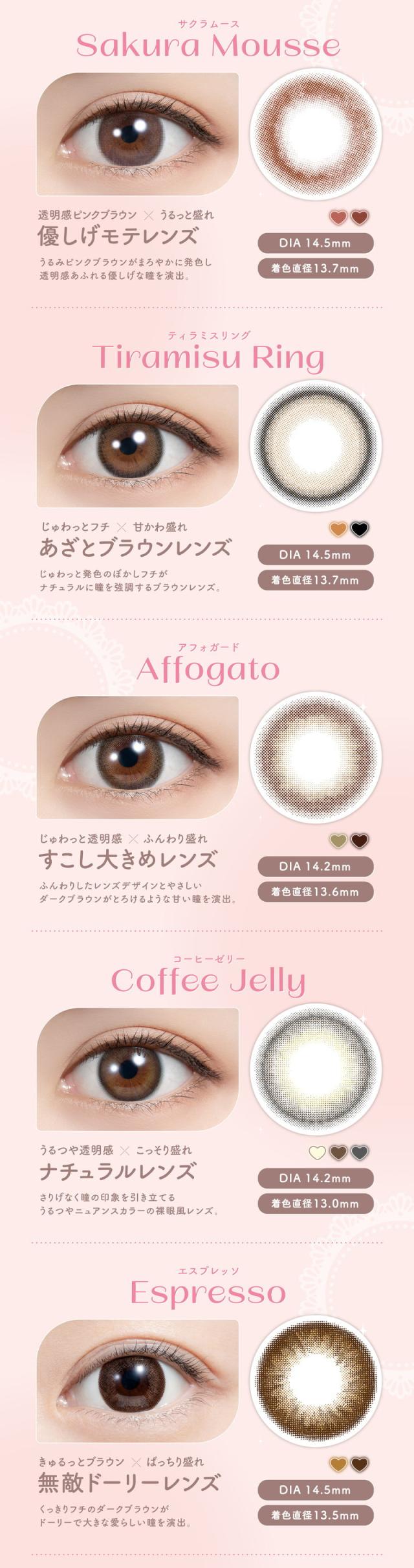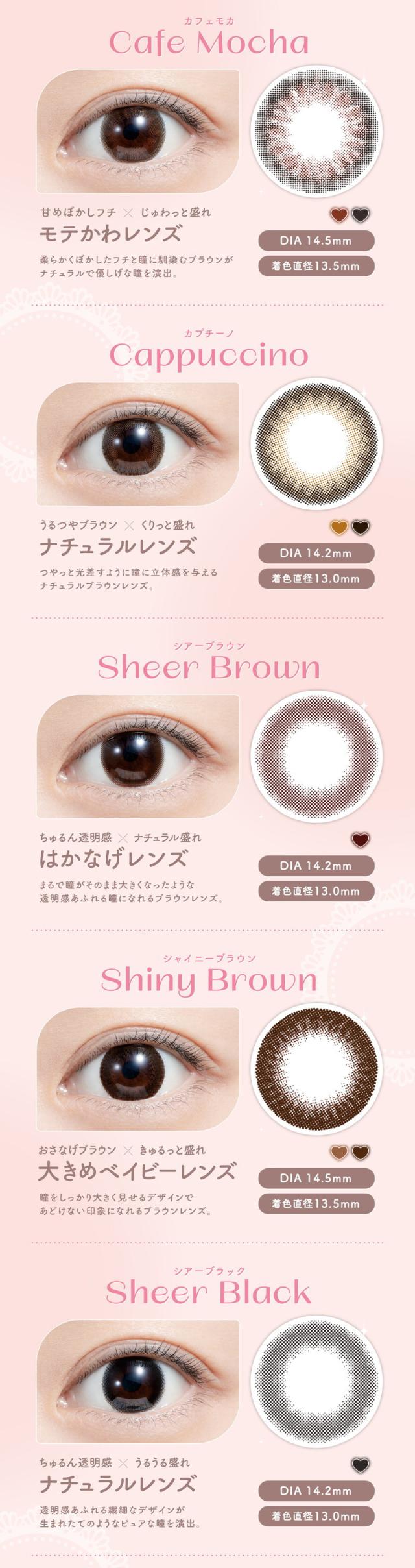 ・展開カラー:ブリュレパール アーモンドプードル ウーロンティー タルトタタン サクラムース ティラミスリング アフォガード コーヒーゼリー エスプレッソ カフェモカ カプチーノ シアーブラウン シャイニーブラウン シアーブラック チュールブラウン チェスナット