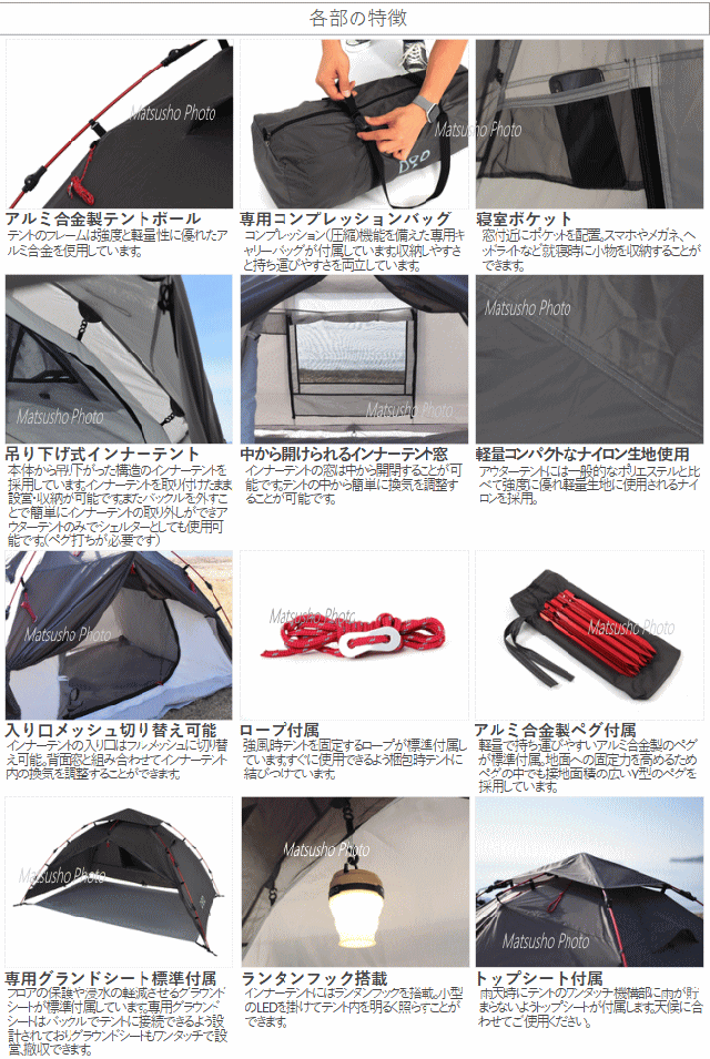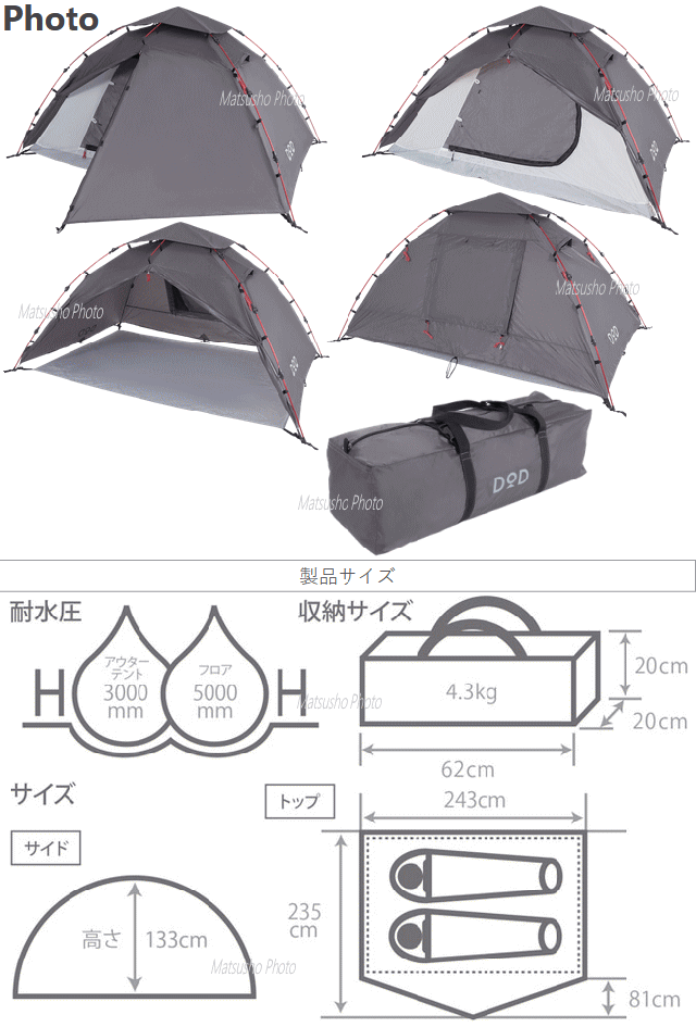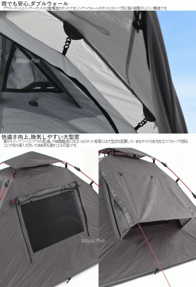 キャンプツーリングをもっと快適に楽しくするダブルウォールのワンタッチテントです。脚を伸ばして紐を引くだけでアウターテント、インナーテント、グランドシート、荷物の置ける前室がすべて完成。キャンプ場到着後すぐに設営が完了するのでゆったりとキャンプのリラックスタイムを楽しむ事ができます。■カラー:グレー■組立サイズ(外寸)約W243×D235×H133cm■インナーサイズ約W225×D145×H110cm■収納サイズ約W62×D20×H20cm■重量約4.3kg(付属品含む)■収容可能人数大人2名■最低耐水圧[アウターテント]3000mm[フロア]5000mm■付属品:ペグ14本、ロープ6本(テントに取り付け済)、グランドシート(インナーテントに取り付け済)、トップシート、キャリーバッグ※設営所要時間は個人の習熟度などに左右されます。2019年10月出荷分より前室構造、バックウィンドウサイズ、生地スペック、自在の素材等の変更を行っています。2021年9月当社出荷分より生地の色味を変更しました。