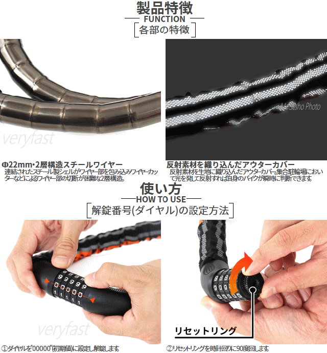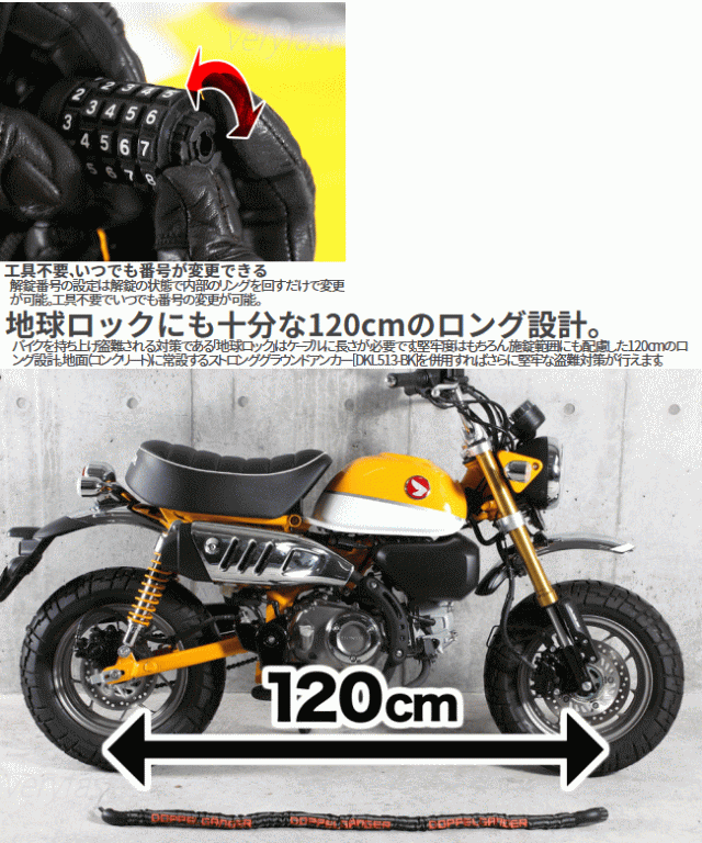 愛車の盗難対策を強化すればするほど自動的に増え続けるロック類の鍵。バイクを乗車する度に合鍵を探しては作業する手間と労力が発生します。この労力は盗難対策によって得られる安心感との代償とも言えカギが増加する問題はバイクを大切にする人ほど避けては通れない現象だと考えます。増加する事でジャラジャラしがちなバイクに関する鍵の数を減らしスマートに。キーレス化対策におすすめのバイク用ケーブルロック。■カラー:ブラック・オレンジ■サイズφ2.2×120cm■製品総重量(付属品含む)約775g■材質:スチール・亜鉛合金■原産国:中国※再設定した暗証番号は必ず忘れない様にして下さい。本製品は盗難予防を目的としたもので盗難防止を保証するものではありません。ロック本体のカバーに施されているプリントは強い摩擦や温度等により衣服等に付着する可能性があります。衣服等で強く擦ったり長時間密着させたりしないで下さい。また温度や湿度の高い時には付着しやすくなりますので衣服等の付着しやすいものと擦れたり密着しないようにして下さい。