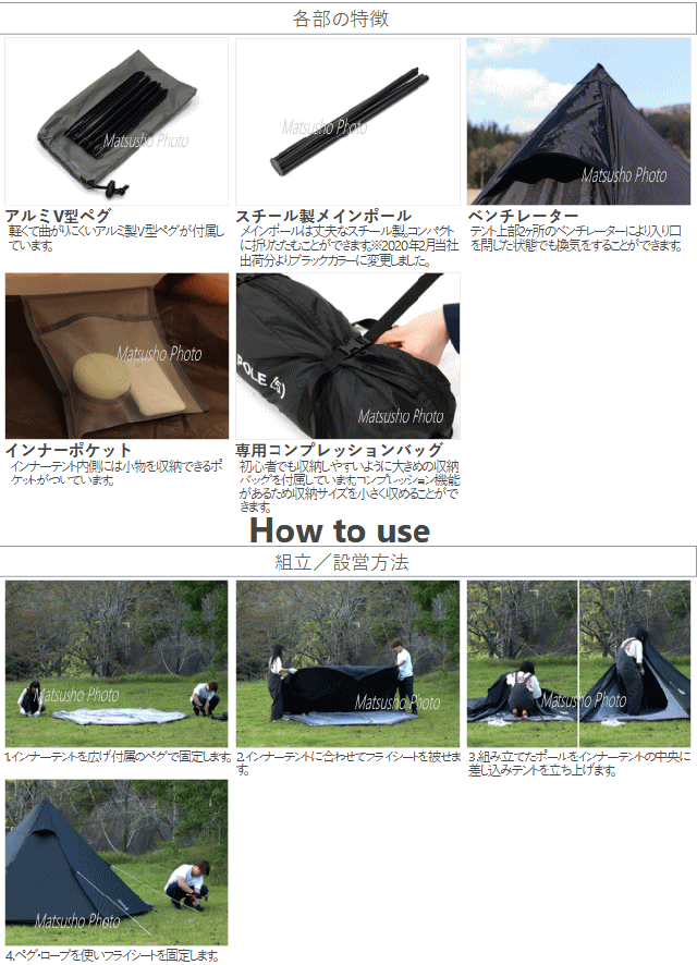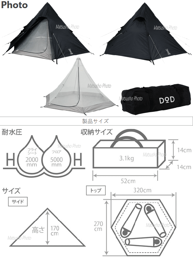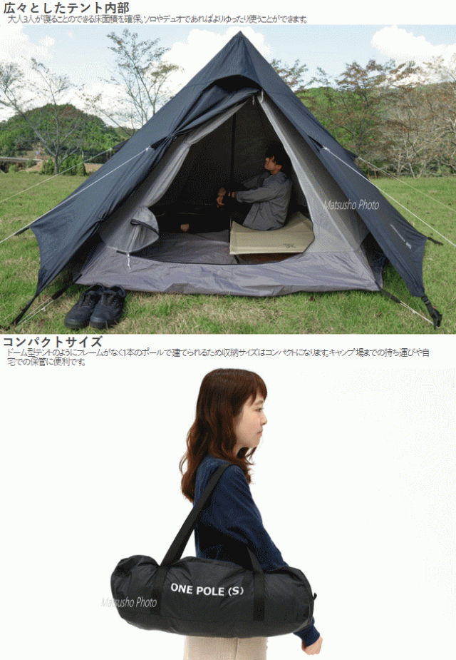 ペグを打ち込みポールを立ち上げれば完成するシンプルなワンポールテント。少人数のキャンプに適した3人用サイズ。大人3人が寝る事のできる床面積を確保。ソロやデュオであればよりゆったり使う事ができます。ドーム型テントの様にフレームがなく1本のポールで建てられるため収納サイズはコンパクト。キャンプ場までの持ち運びや自宅での保管に便利。■カラー:ブラック■組立サイズ(外寸)約W320×D270×H170cm■インナーサイズ約W270×D230×H170cm■収納サイズ約W52×D14×H14cm■重量約3.1kg(付属品含)■収納可能人数大人3名■最低耐水圧[フライシート]2000mm[フロア]5000mm■付属品:キャリーバッグ、ペグ×13本、ロープ×6本(テントに取付済)※ロかかりープの引っかかりを良くする為、ペグのフック部分が鋭利な形状になっています。抜き取る際にはペグ抜き等の道具を使って下さい。2020年2月当社出荷分よりタープ連結による破損を防ぐ為にフライシート天頂部のループをなくしました。生産ロットによりメインポール底部キャップの形状が異なります。1