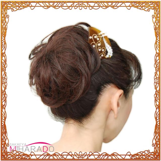 すこし濃い目のべっこう風の色あいにパールビーズとアラベスク模様のデコパーツの美しいかんざしです。