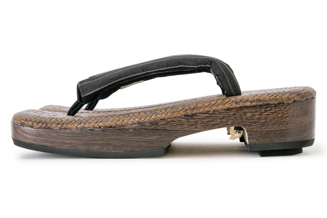 天にはさらりとした涼しげな網代張りの天然素材を使用した低反発でクッション性の高い右近台に、シンプルな縞の小千谷縮の鼻緒が挿げられた、創美苑オリジナルの粋なデザインです。