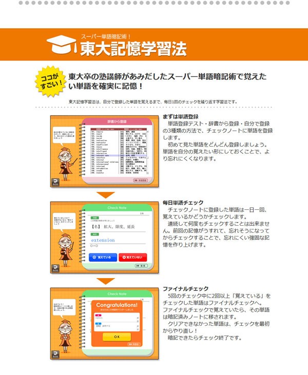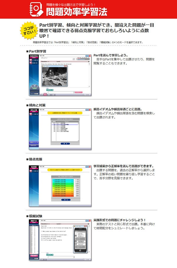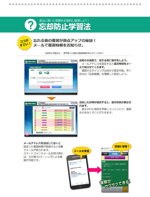 ただTOIEC® TESTの問題を解いているだけでは点数は上がらない!耳を鍛え、目を鍛え、頭を鍛える教材こそTOEIC TEST上達のための秘訣!スマホとの連動が、通勤時間などスキマ学習をフルに活用できる!ゲーム学習、3分学習、脳機能開発など楽しい要素も満載!編集機能を上手に活用すれば一生ものの教材!
