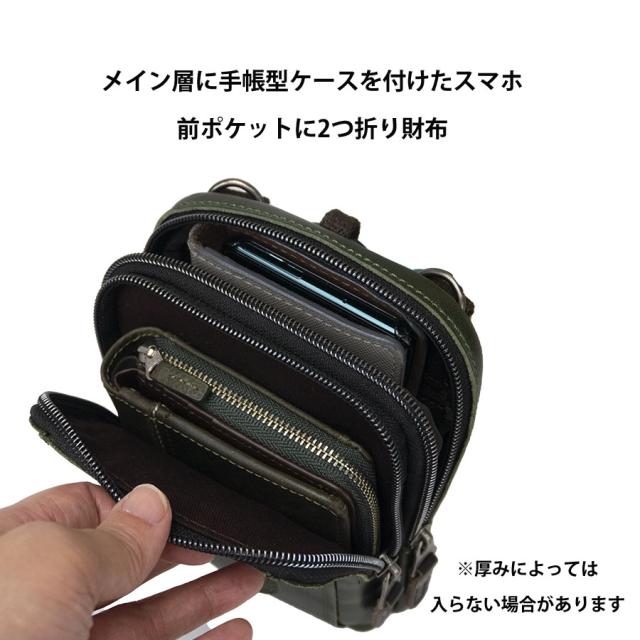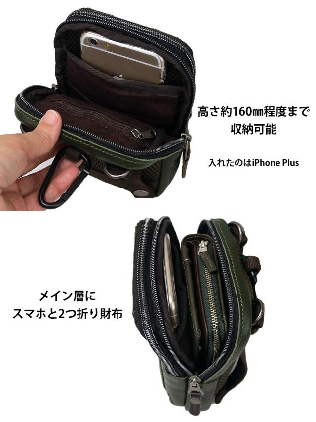 高さ約160mm程度のスマホ、2つ折り財布がコンパクトに収まる本革ベルトポーチ。