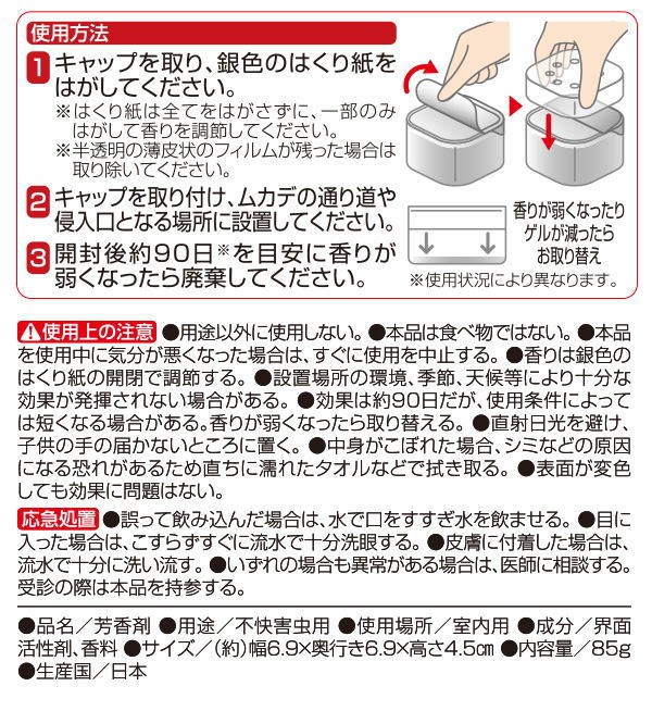 ムカデが嫌がる香りの置き型芳香剤。さわやかなグリーンハーブの香り。侵入を防ぎたい場所にポンっと置いて簡単。ムカデ寄らず!寄せつけず!殺虫剤不使用。約90日効果持続※1【内容量】85g【サイズ】(約)幅6.9×奥行き6.9×高さ4.5cm【成分】界面活性剤、香料【用途】不快害虫用【使用場所】室内用【製造国】日本製【パッケージサイズ】約幅6.9×奥行き6.9×高さ4.5cm(ヘッダー3cm含む)【梱包状態】化粧箱