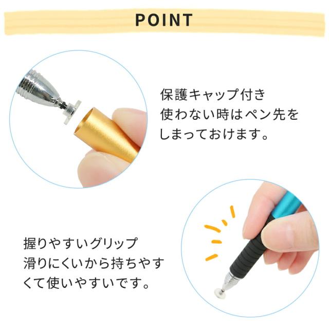タッチペン/スマホ/スマホタッチペン/スタイラスペン/スマートフォン/タブレット/iPad/iPhone/android/iOS/対応/操作/絵描き用/ゲーム/イラスト/ゲーム/メモ/書きやすい/握りやすい/なめらか/クリアディスク/導電性/導電繊維/保護キャップ/グリップ/自宅/オフィス/持ち運び/軽量/光沢/高級感/カラフル/ブラック/ゴールド/シルバー/スカイブルー/ブルー/ピンク/レッド