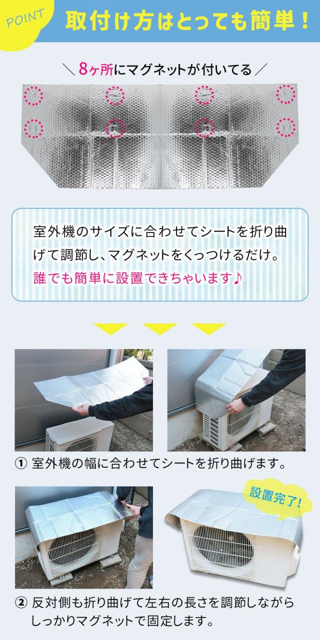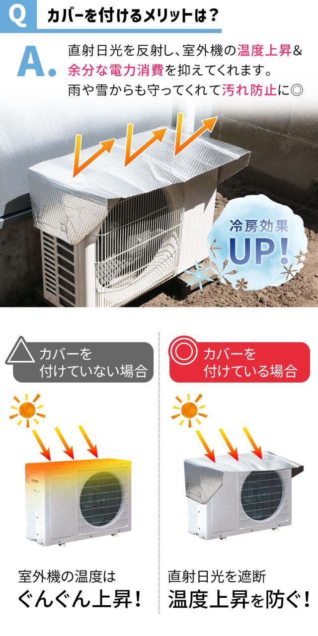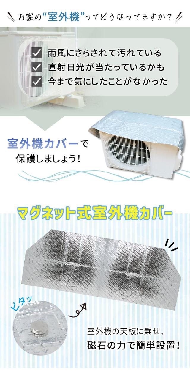 室外機/カバー/遮光/反射/エアコン/エアコン室外機/遮熱/冷房/効率/空調/冷暖房/アルミ/負担/軽減/太陽光/太陽光遮断/電気料金/節電/冷却/直射日光/直射日光遮断/マグネット式/かぶせるだけ/簡単取付/簡単設置/磁石/クーラー室外機カバー/クーラーの室外機カバー/エアコンの室外機カバー/夏/日よけ/日除け/室外機カバーアルミ製/室外機カバーアルミ/マグネット/必要か/diy/ほこり/保護カバー/節電対策/節電グッズ/ひさし/簡単/シルバー/暑さ対策/断熱/電気代/電気代節約/反射板/クーラー/汚れ防止/新生活/おしゃれ/折りたたみ/軽い/空調効率/eco/工事なし/保護フード/ガード/便利グッズ/