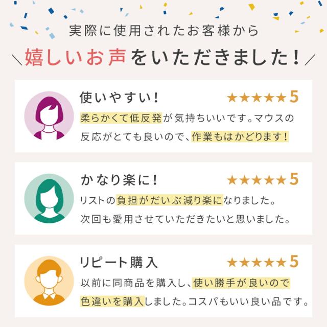 - リストレストが程よい弾力と丁度いい高さで手首が疲れにくくなりました。 また、裏面は滑りにくくなっていて操作中にパッドがずれることもなく快適です。