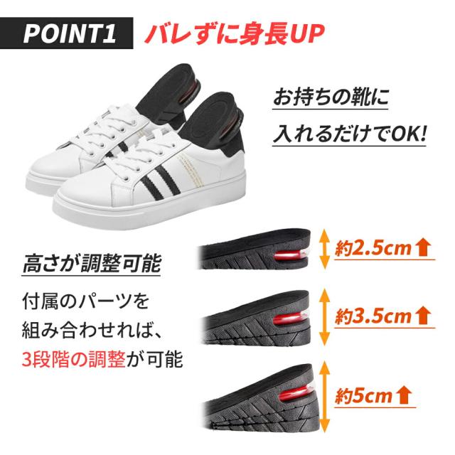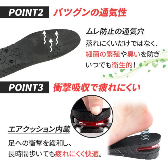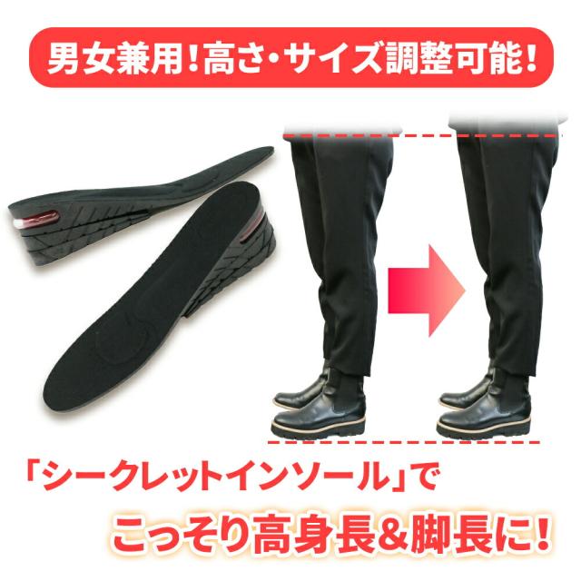 メンズ/メンズ靴/男/男性/レディース/レディース靴/女/女性/ブーツ/かかと/中敷き/スニーカー/インソール/シークレット/インソール シークレット/2cm/3cm/4cm/5cm//調整可能/最大5cm/高身長/スリム/脚長/美脚/身長UP/おしゃれ/身長アップ/春/夏/秋/冬/春物/秋物/冬物/春服/秋服/冬服/エアクッション/エア/空気/革靴/美脚効果/クッション性/衝撃吸収/衝撃緩和/黒/男性用/女性用/兼用/シューズ/春靴/秋靴/冬靴/消臭/通気性/蒸れにくい/ムレ/ムレ防止/エアクッション/疲れにくい/