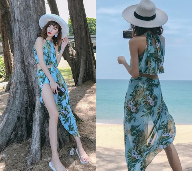 水着 レディース ビキニ 3点セット ワイヤー入り パット付き ハイネック バンドゥ ブラ スカート パレオ風 体型カバー セパレート