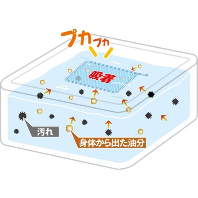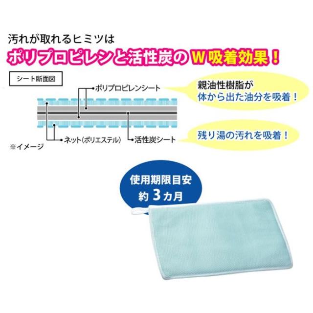 残り湯の皮脂・湯あかを吸い取り清潔に!お風呂に浮いた皮脂・湯あかを吸着するシートです。球状のものに比べ表面積が広く、吸着効率が良く、頑固な汚れのつけ置き洗いの際の、油汚れも吸着します。材質のポリプロピレンは親油性樹脂で、体から出た油分を吸着します。活性炭シートが残り湯の汚れを吸着します。雑菌が繁殖する原因となる汚れを吸着するので、翌日にぬめりや濁りが発生しにくくなります。使用期間の目安は約3カ月です。