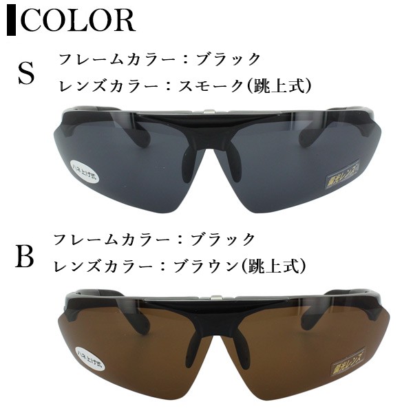 | S フレームカラー:ブラック レンズカラー:スモーク跳上式(偏光) B フレームカラー:ブラック レンズカラー:ブラウン跳上式(偏光) | 素材 レンズ材質:プラスチック(偏光) フレーム材質: プラスチック(塗装) 仕様 ブルーライトカット 、跳上式 フレキシブル鼻パッド、フレキシブル耳掛け |