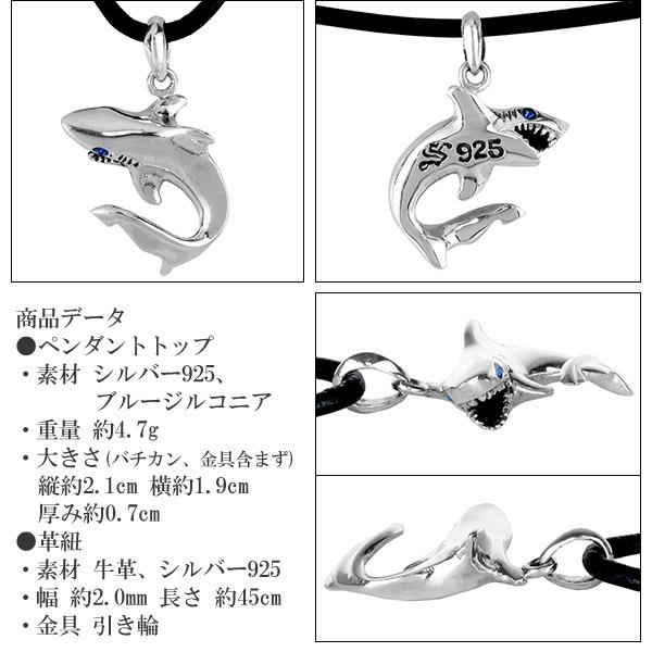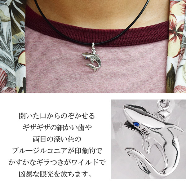 ネックレス レザー チョーカー 革紐 サメ 鮫 シャーク ブルージルコニア シルバー ペンダント シルバー925 紐 革ひも 黒 ブラック