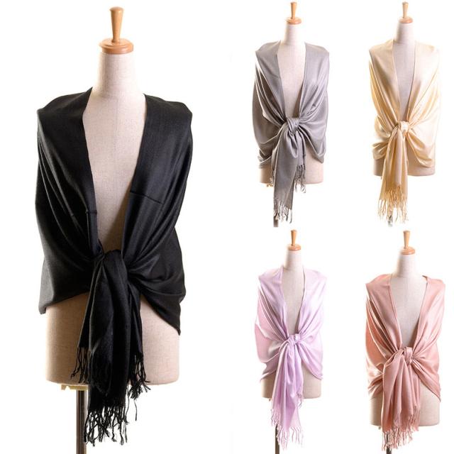 まるでパシュミナのようななめらかな肌ざわりのアクリル大判ショール。結婚式や冠婚葬祭などのフォーマル、普段使いでもOKな万能ストールです。