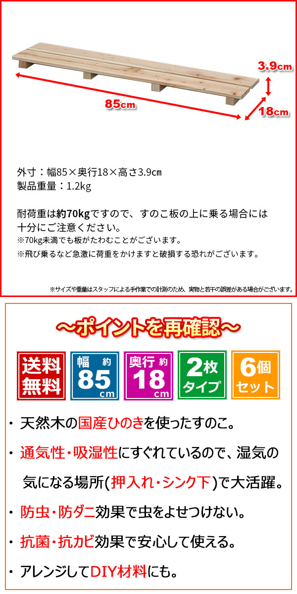 ひのき すのこ『国産桧すのこ 板2枚』(6個セット) 幅85cm 奥行き18cm 高さ3.9cm 日本製ひのきスノコ ヒノキスノコ 檜簀子 (NHS-002)
