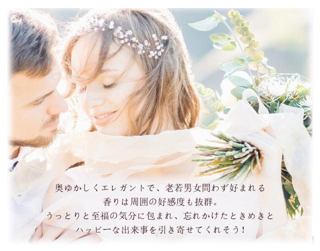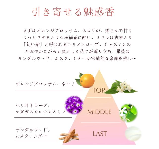 | 香り | 〇トップノート オレンジブロッサム、ネロリ 〇ミドルノート ヘリオトロープ、マダガスカルジャスミン 〇ラストノート サンダルウッド、ムスク、シダー |