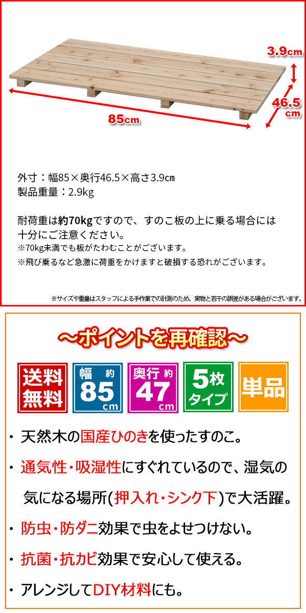 ひのき すのこ 国産桧すのこ 板5枚 幅85cm 奥行き47cm 高さ4cm 日本製ひのきスノコ ヒノキスノコ 檜簀子 簀の子 シンプル 天然木 すのこ板(スノコ板) 脱衣所 洗面所 押し入れ キッチン