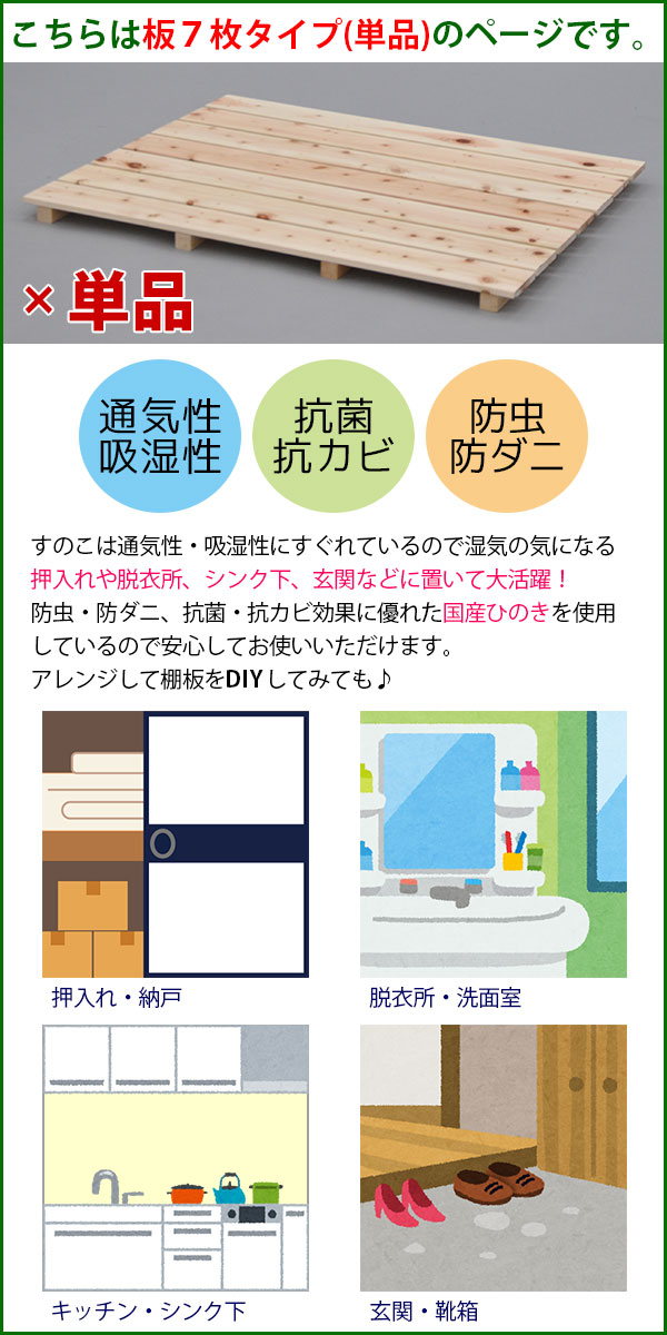 | 国産桧すのこ 板7枚は、天然木の国産ひのきを使ったすのこです。 |