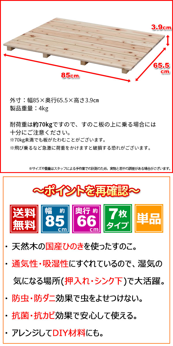 ひのき すのこ 国産桧すのこ 板7枚 幅85cm 奥行き66cm 高さ4cm 日本製ひのきスノコ ヒノキスノコ 檜簀子 簀の子 シンプル 天然木 すのこ板(スノコ板) 脱衣所 洗面所 押し入れ キッチン