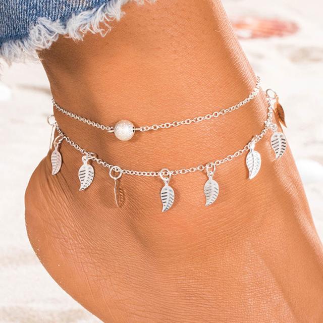 銀色の2連チェーンにいくつもの羽をモチーフにしたフェザーチャームとボールビーズをセットしたボヘミアンなアンクレット。