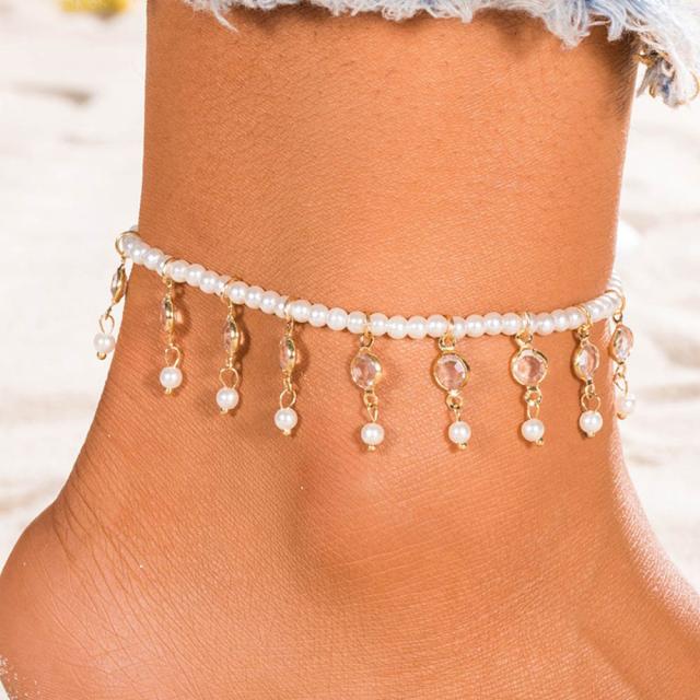 伸縮性のゴムのテグスにイミテーションのパールとクリスタルのラインストーンのチャームが揺れるアンクレット。止具がないので装着も簡単。