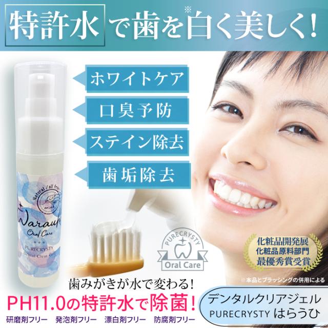 【デンタルクリアジェル】 歯の汚れを落とし、歯を白くして、口臭、虫歯予防、歯周病や歯肉炎予防まで1本で全てケアできる歯磨きジェル。特許取得のPH11.0強アルカリ性イオン水で磨きます。ヤニ汚れや着色汚れも一瞬で浮き上がらせ、お口の細菌を除菌。歯を白くし、口内環境を整えます。研磨剤、発泡剤、漂白剤、アルコールは入っていません。