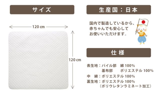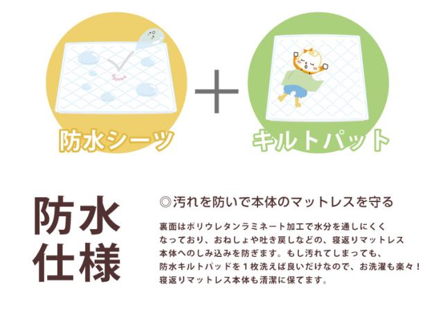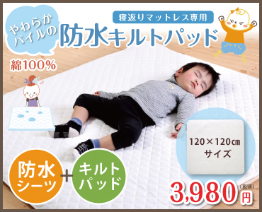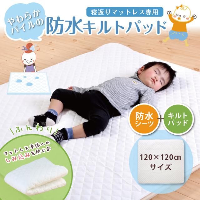防水キルトパッド 寝返りマットレス専用サイズ(120×120cm)赤ちゃんのおねしょを布団に浸み込ませない防水パット! ベビー布団の必需品