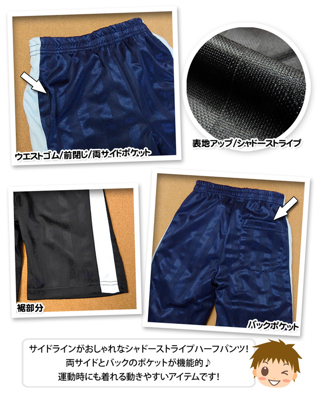 [特長]・Blue Mart(ブルーマート)・ハーフパンツ ・ウエストゴム・シャドーストライプ・前閉じ ・ポケット3P・サイドライン・子供用 ・男の子